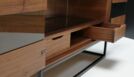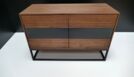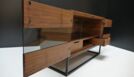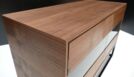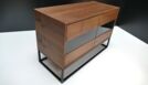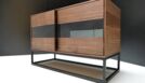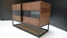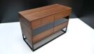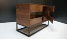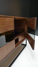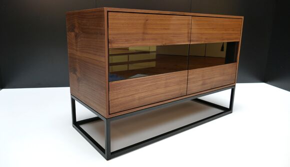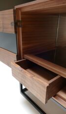 Das Gesellenstück ist ein modern gestaltetes Sideboard. Es besteht aus einem großen Hauptkorpus, zwei Türen, drei Schubladen, einem Schlitz- und Zapfenrahmen als Fach und einem Sockel. Es ist aus Platten mit Nussholzfurnier und massivem Nussholz gefertigt. Die handgezinkten Laden befinden sich unter dem Fach. Das Sideboard steht auf einem Gestell, welches aus schwarzem Formrohr besteht.