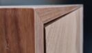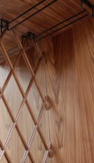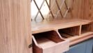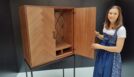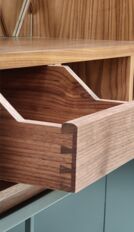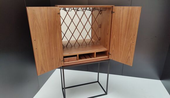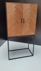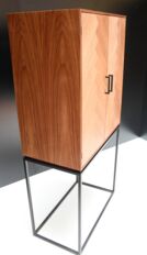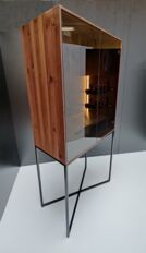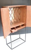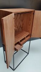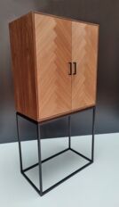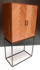 Bei dem von mir entworfenen Gesellenstück handelt es sich um einen Barschrank. Das Hauptelement von meinem Barschrank ist ein Korpus, welcher mit amerikanischer Nuss furniert ist. Durch einen Distanzrahmen wird der Korpus mit dem Gestell aus Formrohr verbunden. Öffnet man die Türen mit Fischgratmuster, springt einen direkt der Spiegel mit einem Rauten-Gitter aus Nussholz ins Auge.  Ein Mittelboden mit zwei eingezogenen Mittelwänden teilt den Innenraum des Barschrankes in einen kleinen und einen großen Teil. Im unteren, kleineren Bereich befinden sich links und rechts jeweils eine handgezinkte klassisch geführte Schublade im Stil eines englischen Zuges, wobei eine Schublade ein Magnetschloss hat. In dem mittleren Fach befinden sich Fräsungen für Weinflaschen.
