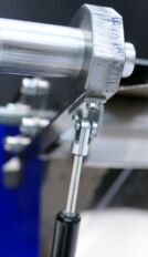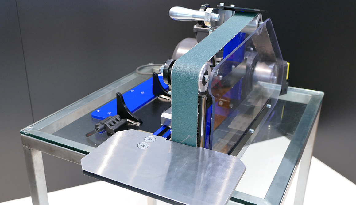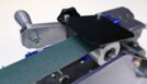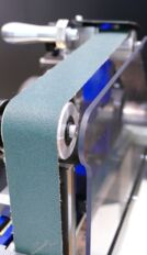 Mit diesem Universal-Bandschleifer können jegliche Metalle bearbeitet werden. Für die Inbetriebnahme ist keine Werkstatt mit Starkstromanschluss nötig, da der 1,5KW Motor mit einem 230 Volt Anschluss ausgestattet ist. Das Gerät kann dank der Senklochbohrungen in der Kippplatte auf verschiedensten Werkbänken montiert werden. Durch die 10mm dicke Grundplatte und die robuste Bauweise wird ein ruhiger Arbeitslauf ermöglicht. Die Spannrolle, deren horizontaler Winkel über eine Sternkopfschraube verstellt werden kann, ist am Spann-Arm angebracht und richtet das Schleifband aus. Auf der Rollen-Aufnahmeplatte können verschiedene Rollen montiert werden, mit denen verschiedene Radien geschliffen werden können.