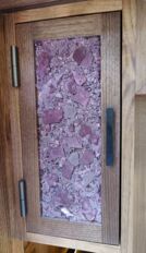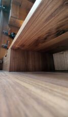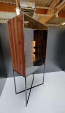 Bei dem von mir entworfenen Gesellenstück handelt es sich um einen Barschrank in Kombination mit Holz, Glas und Leder. Der Korpus ist aus amerikanischer Nuss auf Gehrung verleimt. Die schlichte und symmetrische Form verleiht dem Möbelstück eine gewisse Eleganz. Ein Mittelboden mit eingezogener Mittelwand teilt den Innenraum des Barschrankes in zwei Teile. Im unteren, kleineren Teil befinden sich zwei handgezinkte und klassisch geführte Schubladen, welche ebenfalls aus amerikanischer Nuss gefertigt sind. Im oberen Teil befinden sich zwei kleine und zwei große Korpusse, in denen verschiedenste Wein- und Scotch-Flaschen Platz finden. Die Füllung der Innentüren sind ganz besonders bestückt, sie bestehen aus Weinstein. Dieses Möbelstück bietet für alle, die es gerne extravagant haben, eine durchaus überall verwendbare Form eines Barschrankes. Die Grundidee fokussiert auf die Funktionalität. In sehr modern eingerichteten Räumen kann dieser Barschrank als Stilelement vor einer sonst sparsam beschmückten Wand verwendet werden.