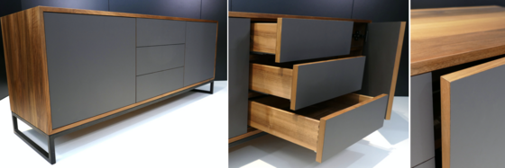 Bei meinem Abschlussprojekt handelt es sich um ein Sideboard in Nuss massiv. Es verfügt über zwei Türen und vier Schubladen, wobei eine der vier Schubladen welche sich hinter der rechten Tür befindet klassisch geführt ist. Hinter der linken Tür bietet ein großer Stauraum, Platz für diverse Ordner oder Schnellhefter. In den 3 Laden lassen sich Bücher oder DVDs unkompliziert verstauen. Die Oberfläche des Sideboards ist geschliffen und in G10 lackiert. Die Türen sind mit einer speziellen Oberfläche beschichtet (Perfect sens). Durch den zeitlosen Stil dieses Möbels lässt es sich gut in jedermanns Büro oder Wohnzimmer einfügen.