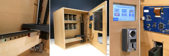 Die hier vorgestellte Arbeit ist ein Süßigkeitenautomat. Über ein Touchdisplay kann die gewünschte Süßigkeit ausgewählt werden. Der entsprechende Betrag der ausgewählten Süßigkeit wird in Form von Münzen in einen Münzprüfer hineingeworfen. Nachdem der Betrag bezahlt wurde wird die Position der Süßigkeit über eine XY Mechanik angefahren. Die, auf einer Spirale platzierte Süßigkeit, wird auf einen Behälter gelegt und über die XY Mechanik wieder zur Ausgabe gefahren.