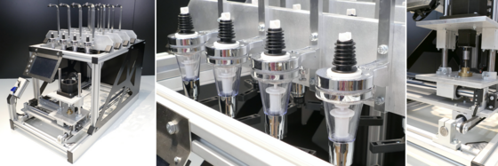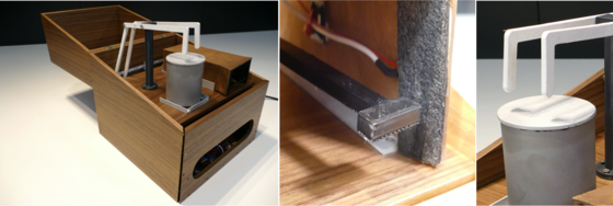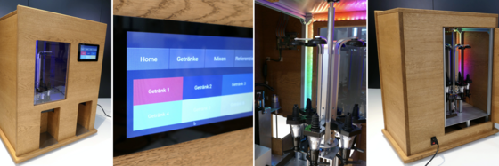 Der automatisierte Getränkemischer mit einem Gehäuse aus massivem Eichenholz ist ideal zum Zubereiten von einfachen Cocktails. Die exakte Portionierung erfolgt durch eine karussellartige Halterung mit sechs Flaschen. Über ein Touchdisplay kann zwischen sechs verschiedenen Getränken ausgewählt werden. Auf Wunsch lassen sich alle Getränke von einem Mixer vermengen. Dabei wird das Glas in die dafür vorgesehene Öffnung gegeben und die Flüssigkeiten werden von einem Edelstahl Rührstab vermengt. Durch ein beleuchtetes Sichtfenster kann jederzeit die Füllmenge der Flaschen eingesehen werden. Durch eine Öffnung auf der Hinterseite des Gerätes können alle Flaschen kurzerhand ausgetauscht und Reinigungstätigkeiten durchgeführt werden.