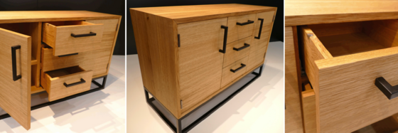 Das von mir entworfene Abschlussprojekt, gefertigt in Eiche, ist ein modernes Sideboard, bestehend aus einem großen Hauptkorpus, einem kleinen in der Mitte liegenden Korpus, drei Schubladen, von welchen eine verschließbar ist, zwei Türen und einem Sockel. Als optischer Blickfang und Modernisierung dient eine Beleuchtung im linken Innenraum des Korpus, die Hirnholzoptik der mittleren Schubladenblende, die linke Glastür, die rechte schwarze Tür und der zusätzliche Bilderrahmen inklusive CNC-gefrästem Motiv.