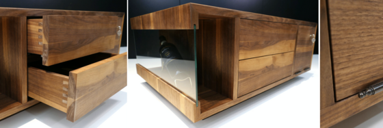Das Möbel, gefertigt aus europäischer Nuss, ist vielseitig als Stauraum für zB. Wertgegenstände, Akten, Dekorationsartikel uvm. nutzbar. Die Schubladen sowie die Fächer hinter der Tür bieten ausreichend Platz um diverse Gegenstände zu verstauen. Wichtige Dokumente lassen sich ebenfalls optimal in der versperrbaren Schublade aufbewahren. Gegenstände, welche auf der Glasplatte abgestellt werden, werden mittels einer Beleuchtung der Firma Häfele beleuchtet. Dies verleiht dem Möbel ein stilvolles Ambiente. Mit seinem dezenten Design ist das Möbel bestens für moderne Wohnräume geeignet und fügt sich gut in das Raumgefüge ein.