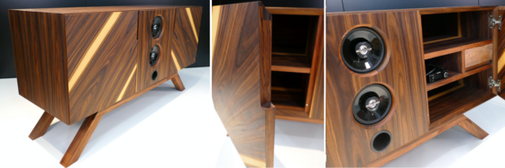 Bei meinem Abschlussprojekt handelt es sich um ein Sideboard mit verbauten Lautsprechern und einem Verstärker. Hinter der rechten Tür befindet sich eine klassisch geführte Schublade zwischen zwei Mittelböden. Hinter der linken Tür befindet sich ein Fach, welches mittels einer Reihenlochbohrung in der Höhe verstellt werden kann. Um Zugriff zu den Lautsprechern zu bekommen, verfügt das Möbel über eine Revisionstür an der Rückseite. Durch das hochwertige Material kann das Sideboard nicht nur als statische Musikbox, sondern auch als reines Dekorationsmöbel genutzt werden.