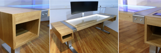Bei dem ergonomischen Arbeitsplatz handelt es sich um einen höhenund neigungsverstellbaren Tisch. Die Arbeitsplatte des Tisches besteht aus Sicherheitsglas, welches mit Eichenholz eingefasst und auf Edelstahlfüßen befestigt ist. Der Tisch verfügt über ein Bedienpanel, mit einem manuellen Modus, womit sich der Benutzer den Tisch wunschgemäß die Höhe und Neigung selbst einstellen kann. Die Höhen- und Neigungsdaten werden visuell auf einem Display angezeigt. Außerdem sind LEDs im äußeren Umlauf der Tischkantenplatte platziert, welche in Gruppen einzeln angesteuert werden können.