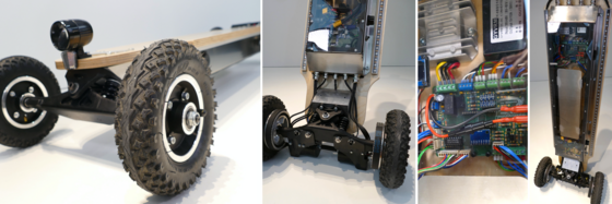 Das Elektro-Offroad-Longboard ist, wie der Name schon sagt, ein elektrisch betriebenes Longboard, das dank großer Luftreifen auch auf unebenem Untergrund und Schotterwegen fahren kann. Die Lenkung des Boards basiert auf Federn anstelle herkömmlicher Gummibacken und ermöglicht so sowohl mehr Stabilität bei höheren Geschwindigkeiten als auch einen allgemein höheren Fahrkomfort. Zusätzlich verfügt das Board über Vorder- und Rücklichter, um auch bei Dunkelheit fahren zu können. Diese Lichter können über einen Helligkeitssensor im Vorderlicht automatisch ein und ausgeschalten werden. An der Oberseite befinden sich zwei LED-Streifen, welche als Geschwindigkeits- und Akkuanzeige dienen. An der Unterseite des Boards sind zwei weitere LED-Steifen angebracht, die in verschiedenen Mustern und Farben leuchten können. Ebenfalls an der Unterseite ist eine Wanne aus Aluminium montiert, die Platz für den großen Akku und die Elektronik des Boards bietet. An den Hinterrädern befindet sich außerdem noch ein mechanischer Sperrbolzen, mit dem das Board mechanisch blockiert werden kann, um es am Wegrollen zu hindern. Die Geschwindigkeit des Elektro-Offroad-Longboards wird über eine kleine Handfernbedienung gesteuert. Außerdem verfügt es über ein USB-Ladebuchse zur Aufladung kleinerer USB-Geräte über den Boardakku, wie z.B. die Fernbedienung oder ein Handy.