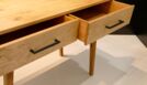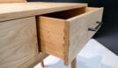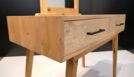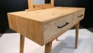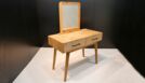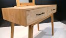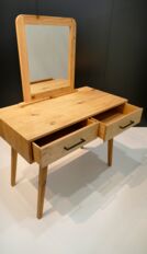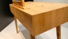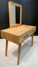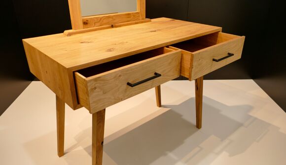 Bei dem Gesellenstück, welches ich selbst entworfen habe, handelt es sich um einen Schminktisch. Der komplette Korpus ist auf Gehrung aus Massivholz gefertigt, die Rückwand ausgenommen. In dem Korpus befinden sich zwei handgezinkte Schubladen, welche klassisch geführt sind. Der Sockel ist konisch nach unten verlaufend und das Gestell im Ganzen ist in sich schräg. Der Spiegel befindet sich in einem abgerundeten Schlitz-Zapfen-Rahmen. Durch die Form und das Design des Schminktisches ist er der optimale Eyecatcher für jeden Raum.