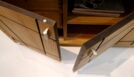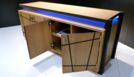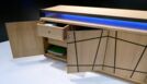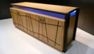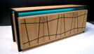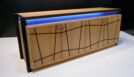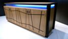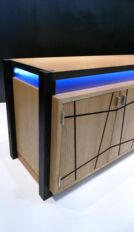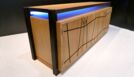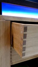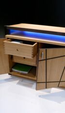 Das von mir entworfene Möbel ist ein Sideboard. Der Korpus ist auf Gehrung gefertigt und aus Tischlerplatten in Eiche furniert. Die Türen besitzen ein eingefrästes, durchlaufendes Muster. Hinter der ersten Tür von links befinden sich zwei handgezinkte Schubladen, welche auf zwei handgefertigten Schlitz- und Zapfenrahmen laufen. Zwischen dem Korpus und der Deckplatte befindet sich seitlich und vorne je ein Streifen satiniertes Glas, das von innen mit LEDs beleuchtet wird. Die Steher sind aus Räuchereiche massiv und werden jeweils so ausgeklinkt, dass der Korpus und die Platte oberhalb in die Steher hineinragen.