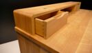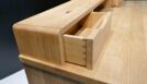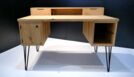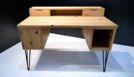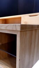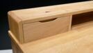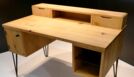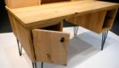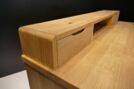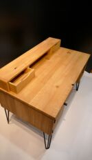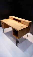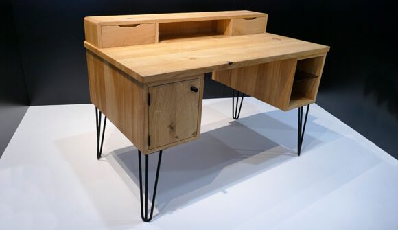 Dieser Schreibtisch ist aus massiver Asteiche gefertigt worden. Er ist aufgebaut aus zwei kleineren Korpora, einer Tischplatte und dem oberen Korpus. Der linke Korpus besitzt eine zwischenschlagende Tür und beinhaltet ein Fach aus einer Schlitz- und Zapfenverbindung mit einer bündigen Füllung. Der rechte Korpus ist nach vorne offen und trägt ein Fach aus Braunglas. Beide Korpora besitzen eine eingenutete Rückwand, da dieses Möbel seinen Platz vor einer Glasfront findet und so jede Seite des Schreibtisches einsichtig ist. Der obere Korpus besitzt jeweils links und rechts eine handgezinkte Schublade. Die Mittelwände des oberen Korpusses wurden als Fingerzinken gefertigt, welche nach oben durchgestemmt sind und somit dem gesamten Möbel noch das gewisse Extra verleihen. Der Schreibtisch steht auf vier außergewöhnlichen Tischbeinen, welche den Tisch perfekt abrunden.