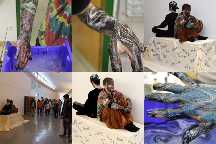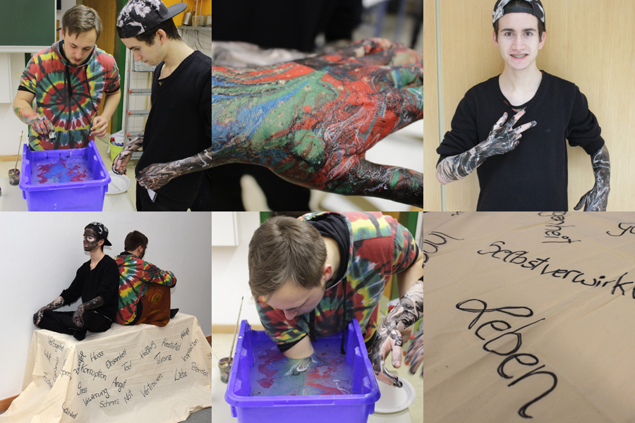 Die Künstlerinnen und Künstler der BE-Gruppe der 9.Klasse setzten sich am 21.2.2017 „in Szene“. Ihr Körper wurde als Material eingesetzt und eine Handlung vollzogen. Diese Handlung / Aktion wurde mit Hilfe von Fotos oder Filmen festgehalten und dokumentiert; hatte das Ereignis stattgefunden!
