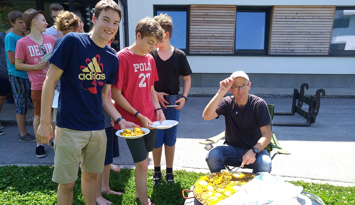 Ingredientes: arroz, gambas peladas, almejas, langostinos, caldo de pescado, sal, perejil, cebolla picada fina, pimiento verde picado fino, tomate picado fino, dientes de ajo picados fino. Die Spanischschüler/innen der 6a und der 6b bereiteten nicht nur Paella, sondern auch leckere Tapas zu: Patatas bravas, quesadillas y tortilla de patata. ¡Qué aproveche!