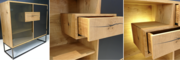 Das von mir entworfene Abschlussprojekt, gefertigt in Eiche, ist ein modernes Sideboard, bestehend aus einem großen Hauptkorpus, einem kleinen in der Mitte liegenden Korpus, drei Schubladen, von welchen eine verschließbar ist, zwei Türen und einem Sockel. Als optischer Blickfang und Modernisierung dient eine Beleuchtung im linken Innenraum des Korpus, die Hirnholzoptik der mittleren Schubladenblende, die linke Glastür, die rechte schwarze Tür und der zusätzliche Bilderrahmen inklusive CNC-gefrästem Motiv.