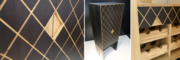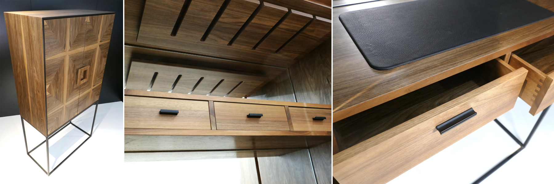 Bei meinem Abschlussprojekt handelt es sich um einem Barschrank. Das Hauptelement ist der Korpus, welcher in europäischer Nuss furniert ist. Die überfälzt aufschlagenden Türen haben eine Karomuster Optik und werden mithilfe eines Schlitz Zapfen Rahmen Griff geöffnet. Im Innenleben verfügt der Barschrank über fünf Schubladen, davon sind zwei Fingergezinkt und mechanisch geführt. Die weiteren drei sind handgezinkt. Im unteren Teil vom Schrank befindet sich ein Mittelboden mit einer Ledereinlage, wo man verschiedene Spirituosen lagern kann. Der am Oberboden angebracht Glashalter bietet Raum für Weingläser. Die Oberfläche des Barschranks ist lackiert.