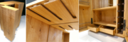 Mein Abschlussprojekt ist ein Barschrank in Bretterbauweise. Das wohl markanteste an ihm sind die zwei Koffertüren, die genug Platz für Flaschen und ähnliches bieten. Beim Öffnen sieht man einen großen Spiegel, der den Innenraum größer Wirken lässt. Darunter befindet sich noch ein kleiner Stauraum für Gläser und ganz unten zwei klassisch Geführte Schubladen. Die Oberfläche ist geölt, bis auf den Sockel, der mit Betonoptik bestrichen und dann lackiert wurde. Dieses Möbel findet in fast jedem Einrichtungsstil seinen Platz, da es zeitlos Design und Handwerkskunst vereint.