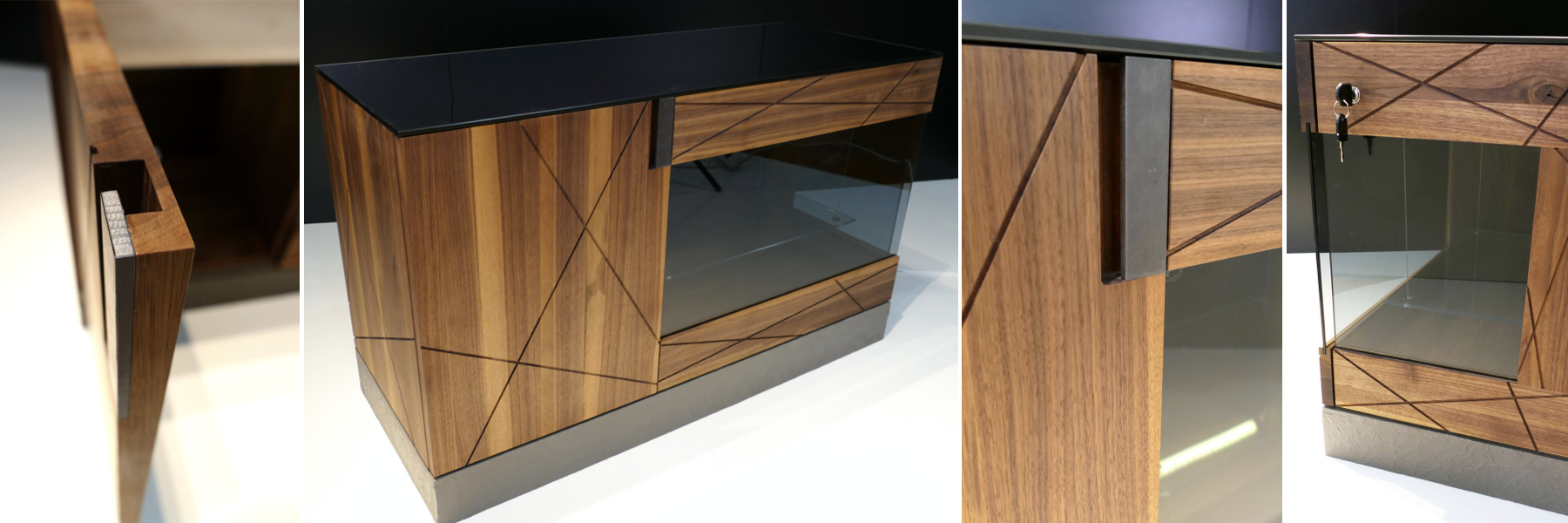 Die Planung für mein Abschlussprojekt begann vor ca. zwei Jahren. Damals begann ich mit groben Entwürfen, welche ich mit der Hand auf Papier skizzierte. Mit der Zeit bekam ich neue Ideen und verwarf alte. Die Komponenten, mit den sogenannten „Designschnitten“, sind aus massiver amerikanischer Nuss angefertigt. Der Obere - und Unterboden, wie auch die Mittelseite sind aus mit amerikanischer Nuss furnierten Paneelplatten. Die linke Seite beinhaltet eine Türe und eine auf Nutlaufleisten geführte Schublade aus Ahorn. Die Front der rechten Seite besteht aus einem verdunkeltem 6mm Sicherheitsglas, welches oben und unten von zwei Massivholz-Stücken, mit eingefrästen Nuten, gehalten wird. Auf der rechten Seite befindet sich eine versperrbare Rahmentür, welche nach vorne offen ist. Diese trägt ebenfalls ein 6mm Sicherheitsglas in sich und wird mittels Blum Topfbänder mit Blu-Motion gehalten. Hinter diesen Glasscheiben befindet sich eine Glasplatte, welche horizontal mit vier Stahlseilen auf dem oberen Boden aufgehängt ist. Das Werkstück ist auf einem 10 cm hohen Sockel mit Beton-Optik montiert. Auf dem Werkstück liegt eine Schwarzglas-Platte, um auch auf der Oberseite einen simplen und sauberen Abschluss zu gewährleisten. Dem Möbel wird durch eine Ambientebeleuchtung der goldene Abschluss gegeben.