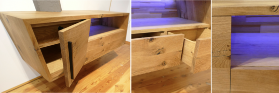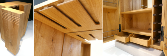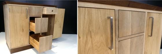 Bei meinem Abschlussprojekt handelt es sich um ein Sideboard in Eiche massiv. Es verfügt über zwei Türen und drei Schubladen, wobei die mittlere Lade klassisch und die übrigen Laden auf Auszügen geführt sind. Hinter der rechten Tür befindet sich ein Fach, welches über eine Reihenlochbohrung in der Höhe verstellt werden kann. Hinter der linken Tür bieten Gläserhalter Raum für Wein-, Schnaps- oder Biergläser. Die Oberfläche des Sideboards ist gebürstet und mit Complex Hartwachsöl geölt. Durch sein schlichtes Design fügt sich das Möbel angenehm in die Optik eines modernen Einrichtungsstils ein.