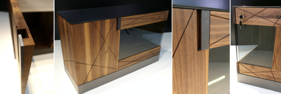 Das Möbel, gefertigt aus europäischer Nuss, ist vielseitig als Stauraum für zB. Wertgegenstände, Akten, Dekorationsartikel uvm. nutzbar. Die Schubladen sowie die Fächer hinter der Tür bieten ausreichend Platz um diverse Gegenstände zu verstauen. Wichtige Dokumente lassen sich ebenfalls optimal in der versperrbaren Schublade aufbewahren. Gegenstände, welche auf der Glasplatte abgestellt werden, werden mittels einer Beleuchtung der Firma Häfele beleuchtet. Dies verleiht dem Möbel ein stilvolles Ambiente. Mit seinem dezenten Design ist das Möbel bestens für moderne Wohnräume geeignet und fügt sich gut in das Raumgefüge ein.