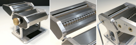 Die aus Edelstahl gefertigte Pasta-Maschine ermöglicht den Benutzer durch ihren flexiblen und simplen Umgang Nudeln herzustellen und ist für die Gastronomie, Feinkostgeschäfte und natürlich für den häuslichen Gebrauch geeignet. Die Hauptwalzen sind durch einen Exzenter auf die richtige Dicke verstellbar, dies ist für verschiedene Nudelsorten notwendig. Mit dem Nudelaufsatz können Spaghetti und Fettucine ohne großen Aufwand hergestellt werden, der Abstand ist nicht verstellbar, da dieser schon voreingestellt ist. Aufgrund der Fertigung aus Edelstahl und Aluminium ist die Pasta-Maschine lebensmittelecht und einfach zu reinigen.