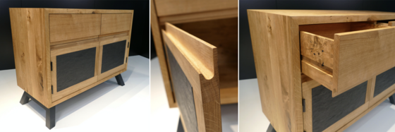 Der Korpus der Anrichte, bestehend aus massiver Eiche, ist an den Ecken auf Gärung miteinander verbunden. Die Linke der Beiden Schubladen ist klassisch mit einer Nutlaufleiste gfertigt, die Rechte ist auf einem Vollauszug geführt. Die Blendenunterseite der Schubladen ist mit einer Griffräsunf versehen. Dieselbe Fräsung ist auch an der Oberseite der Türen zu finden. Die aus jeweils einem Rahmen bestehenden Türen werden durch eingesetzte Echtstein Schieferplatten und dunkle Möbelbänder besonders in Szene gesetzt. Das Möbelstück ruht auf zwei lackierten Leisten, welche auf einem anthrazitgrau lackierten Gestell befestigt sind. Der daraus resultierende Abstand zwischen Unterbau und Korpus verleiht dem Möbel eine Leichte, die abgeschrägten Standfüße eine verspielte Note. Die Kernidee liegt im farblichen Dreiklang, welcher sich aus dem Stein, den dunklen Möbelbändern und dem lackierten Gestell ergibt. Die Oberfläche des naturbelassenen Steins wurde lediglich mit Öl behandelt, um die natürliche Färbung des Schiefers langfristig zur Geltung zu bringen. Durch die Kombination verschiedener Materialien wird dieses Abschlussprojekt nicht nur ein optisches, sondern auch ein haptisches Erlebnis.