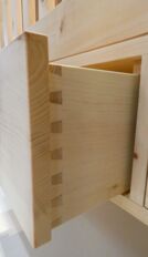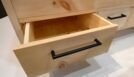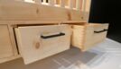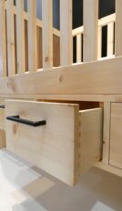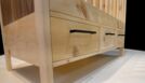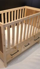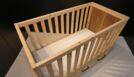 Für mein Gesellenstück habe ich mich für ein Babybett aus Zirbe entschieden, welches ich in vier große Hauptteile einteilte. Zuerst stellte ich die Seitenrahmen her. Die Seitenelemente besitzen jeweils zwei Schlitz- und Zapfen-Verbindungen und eine Nutfräsung, in welcher die beidseitig mit Nuss furnierten Spanplatte eingenutet ist. Das Gitter auf beiden Seiten des Bettes besteht ebenfalls aus Zirbe und hält die insgesamt 22 Gitterstäbe mit einer Loch-Zapfen Verbindung zusammen. Der Korpus ist ein eigenes Element bestehend aus Zirbe furnierten Spanplatten, welche mit Lamellos verbunden sind. Von den insgesamt drei Schubladen ist die mittlere handgezinkt und jede Schublade besitzt eine Blende aus Massivholz. Die gesetzliche Norm der Gitterabstände wurde miteinberechnet und auch das Innenmaß für die Matratze ist normgerecht mit 120x60cm. Durch die komfortable Höhe des Bettes ist mein Gesellenstück sowohl für das Baby, aber vor allem für die Eltern angenehm zu nutzen.