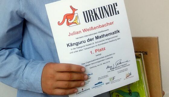 Am Mittwoch, den 25.5.2016, hat im Borromäum die Siegerehrung der Landessieger (3.-12. Schulstufe) des Känguru-Wettbewerbs stattgefunden. Julian Weißenbacher aus der 4A Klasse hat in seinem Jahrgang die Wertung in Salzburg gewonnen und wurde dementsprechend ausgezeichnet. In feierlichem Rahmen erhielt er neben einer Urkunde und viel Applaus auch einige interessante Bücher zum Thema Mathematik.