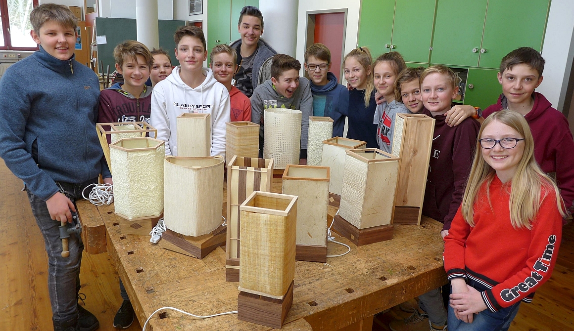 Im Bereich Produktgestaltung/Design sind individuelle Tischlampen entstanden, die zu Hause für stimmungsvolles Licht sorgen sollen. Bei der Herstellung des Lampenfußes sind Maßgenauigkeit und handwerkliches Geschick gefragt. Die SchülerInnen lernen den Umgang mit Stemmeisen und fertigen eine Furnierarbeit an. Der Bau der Lampenschirme ermöglicht individuelle Lösungen, die dem unterschiedlichen Leistungs-Niveau jedes Einzelnen angepasst werden können. Es wurden viereckige, sechseckige oder gebogene Holzrahmen hergestellt, mit Stäben verbunden und mit handgemachten Papieren oder Holzfurnier bespannt.