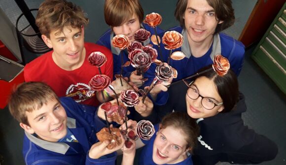Ich bitte um Ruheeeee!, ruft das Hirn in die beflügelte Menge. Ich habe einen Vorschlag. Da wir, wie ihr alle wisst, am Werkschulheim Felbertal zur Schule gehen, haben wir ja alle Möglichkeiten etwas selbst zu machen. Da würde sich nämlich diese Rose aus Kupfer anbieten, die unser Auge in der Unterstufe immer schon bewundert hat. Was haltet ihr davon Füße und Mund gleich zu unseren Lehrern zu schicken, um zu fragen ob wir so eine Rose denn machen könnten?