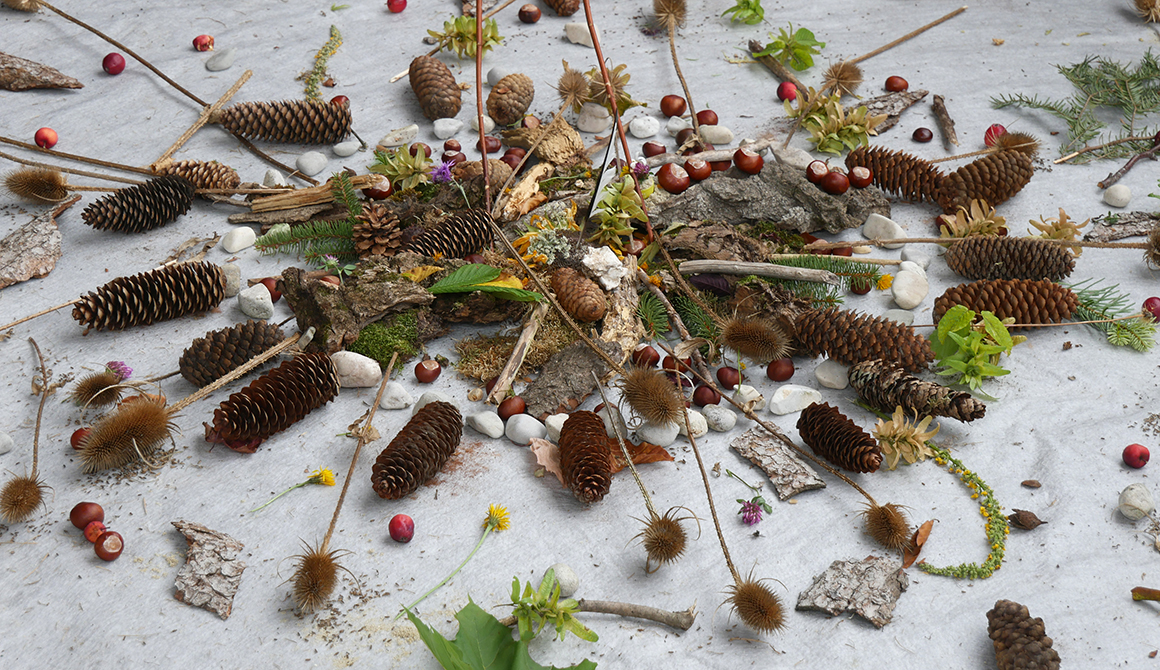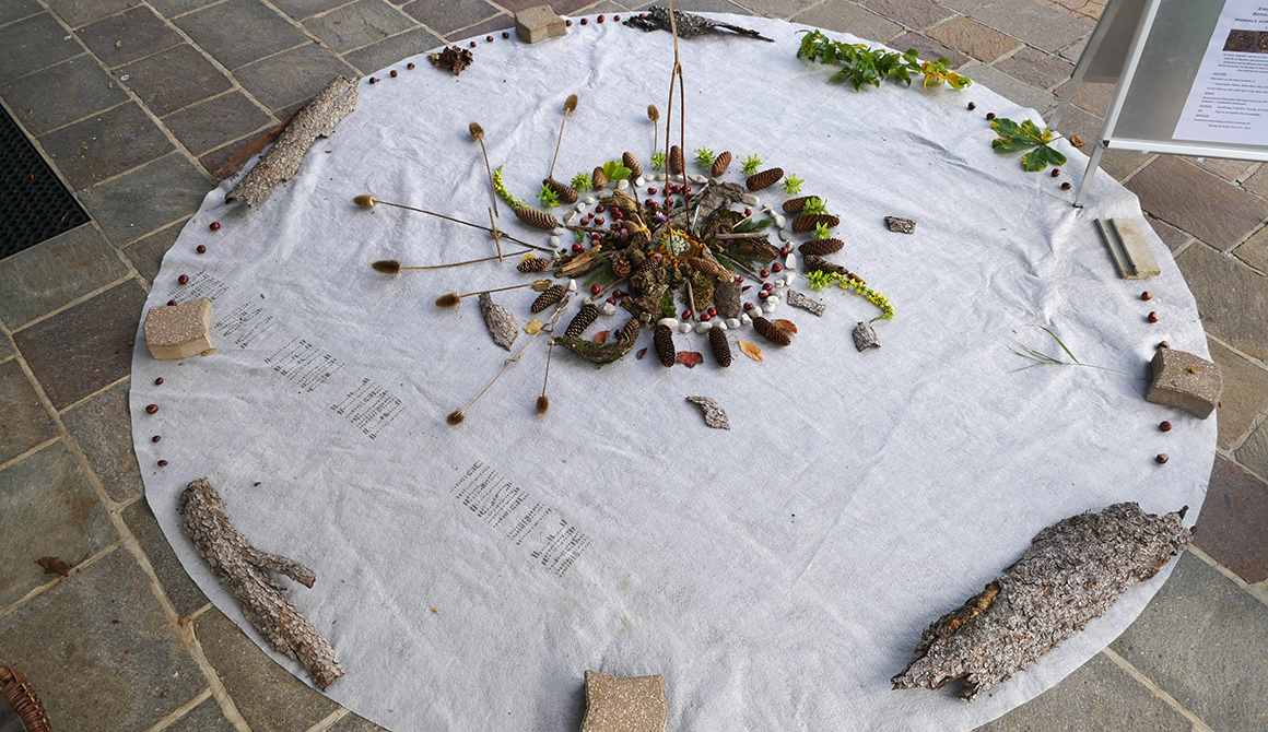 Vor dem Hintergrund des traditionellen Erntedankfests im kirchlichen Jahreskreis erging eine Einladung an die Schulgemeinschaft ein Mandala aus Naturmaterialien entstehen zu lassen. Im Zeitrahmen von einer Woche wurden Materialien aus der Natur gesammelt und vor der Kapelle zu einem Mandala gelegt.