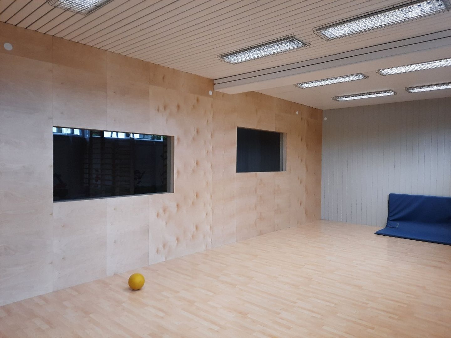 Durch den Einbau von Sprossenwänden können unsere Schülerinnen und Schüler auch bei schlechtem Wetter ihrem Bewegungsdrang nachgehen. Die farbliche Neugestaltung lässt die Räume nun heller und freundlicher erscheinen und durch den Einbau von zwei großen Glasscheiben ist nun auch im waldseitigen Aufenthaltsraum ausreichend Tageslicht vorhanden.