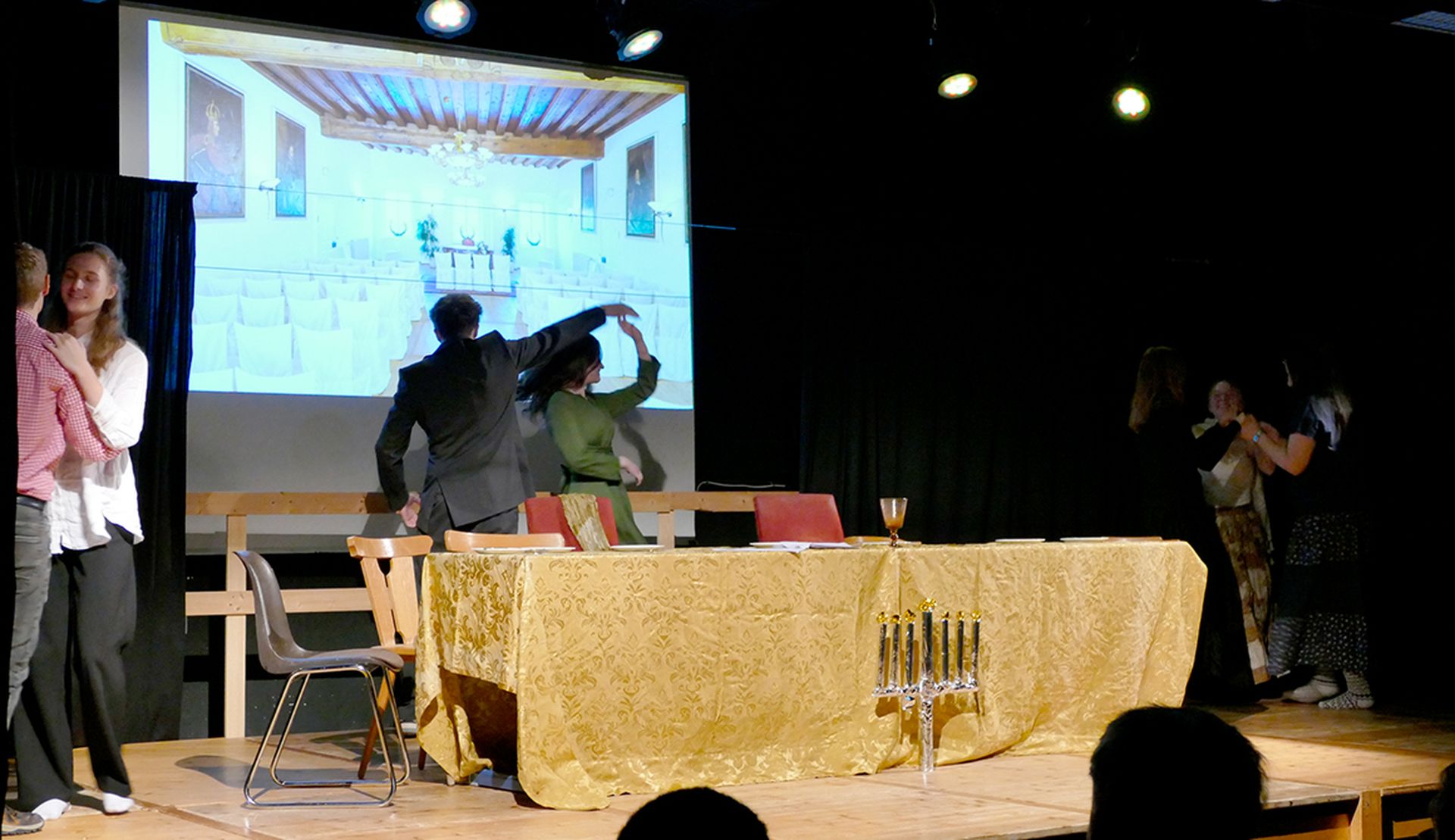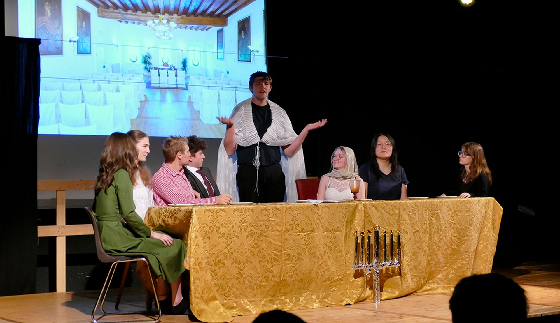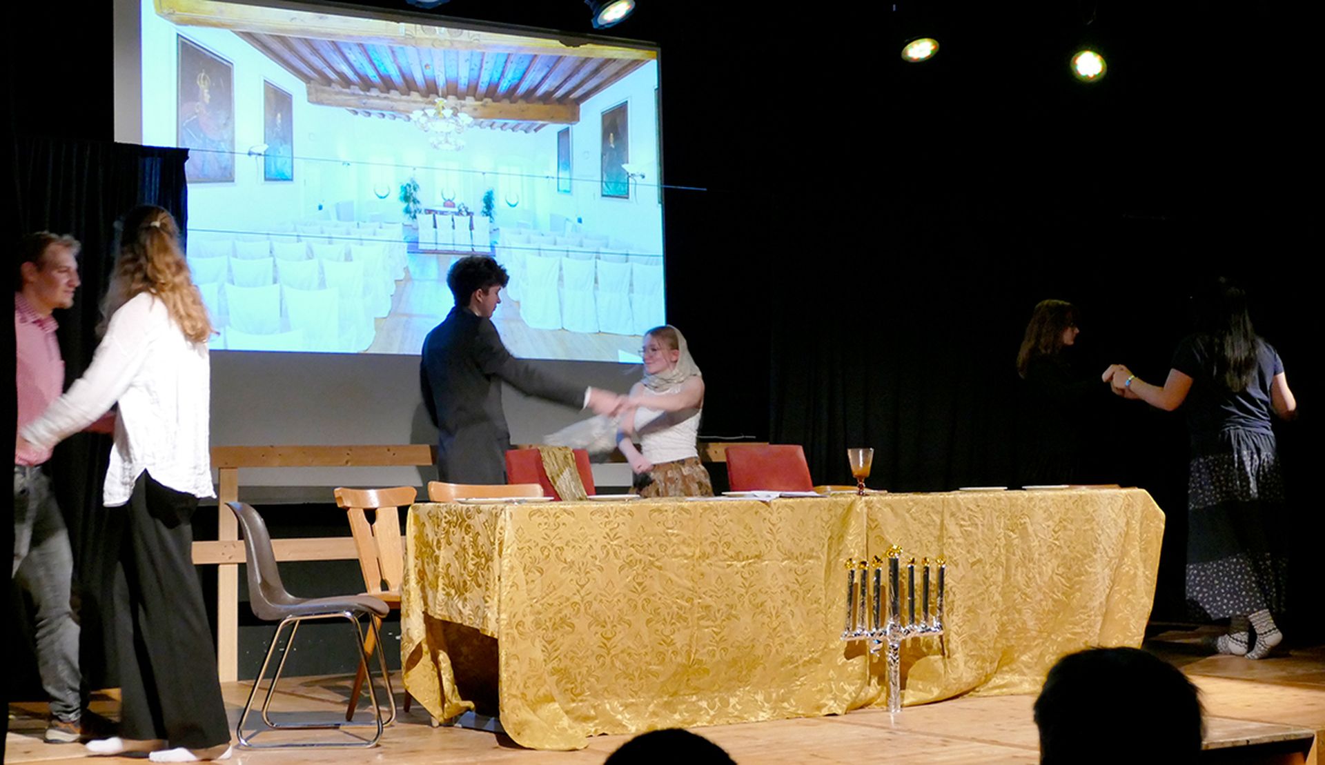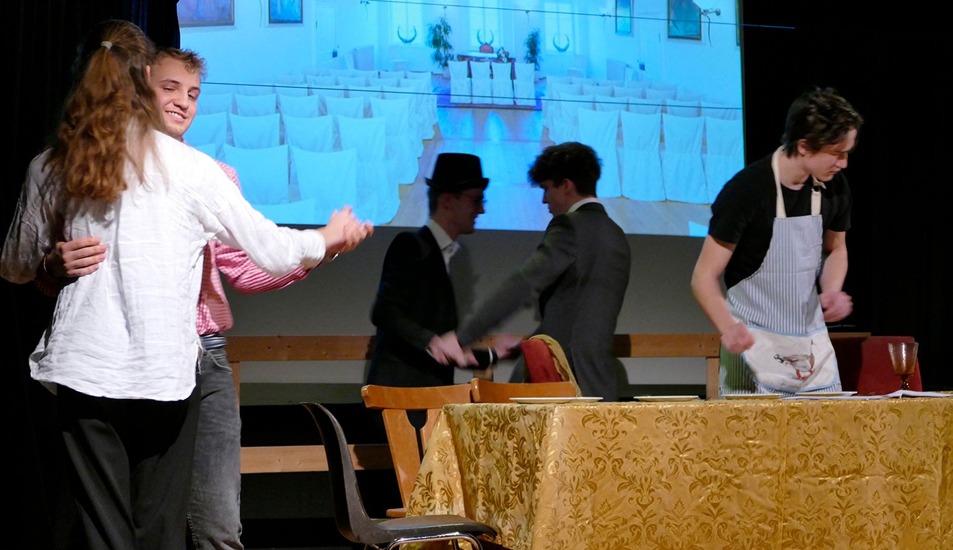 Die 9A brachte am 30. Jänner ein kleines Kammerspiel zu Aufführung. Initialzündung für die Idee war zum einen die NS-nahe Familiengeschichte des Altfelbertalers und Schriftstellers Martin Pollack, der vorige Woche mit 80 Jahren verstorben ist. Zum anderen war diese Woche der 80. Gedenktag des Holocaust. Im Zentrum steht eine jüdisch-christliche Hochzeit, die Anlass gibt die Täter- und Opferseite im 2. Weltkrieg zu beleuchten und die Verbindung zum heutigen Israel-Palästina-Konflikt herzustellen. An den Spielorten Israel, Österreich und Gaza werden die verschiedenen Perspektiven der Akteure dargestellt. Am schrecklichen Ende steht jedoch das Prinzip der Hoffnung, symbolisiert durch den Auftritt einer griechisch- mythischen Figur namens Kairos. Die Umrahmung bildet die Musik des jüdischen Künstlers Leonhard Cohen als auch jiddische traditionelle Musik – im Mittelpunkt steht jedoch die allseits bekannte Mauthausen-Kantate, die durch Mark und Bein geht …