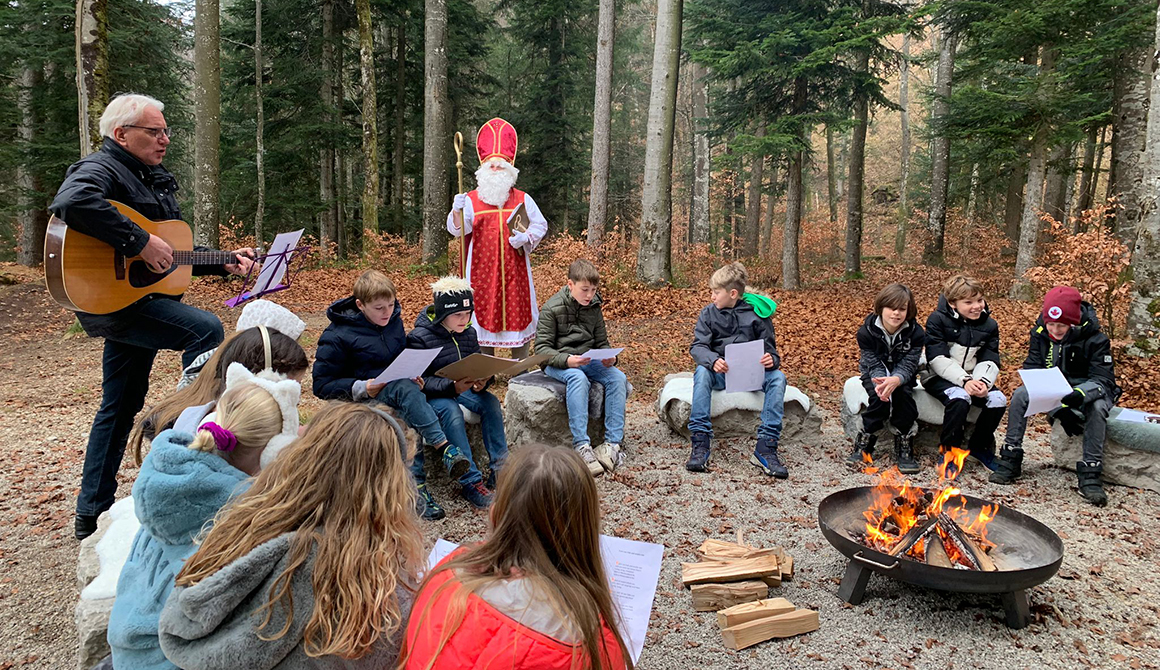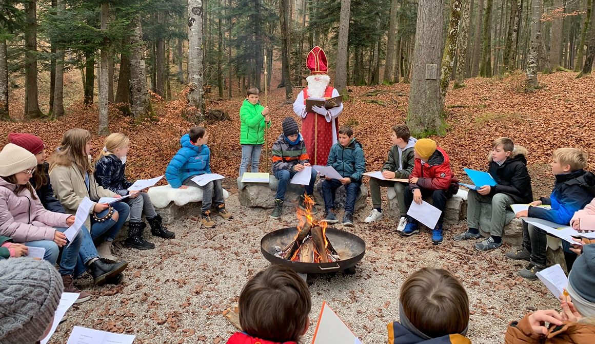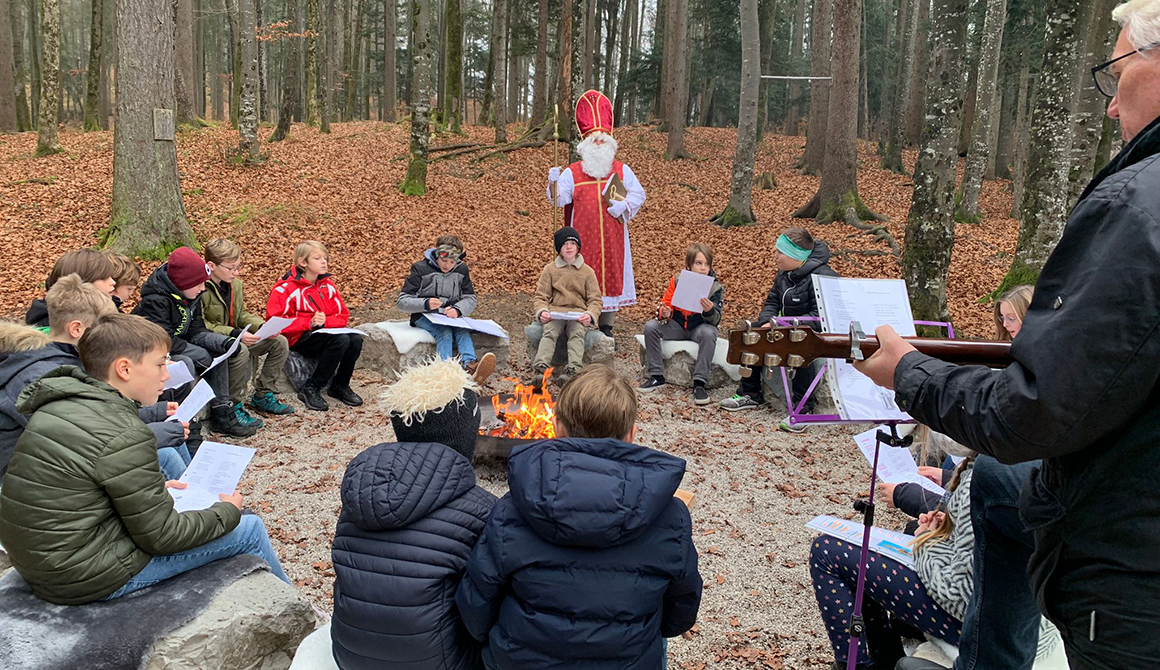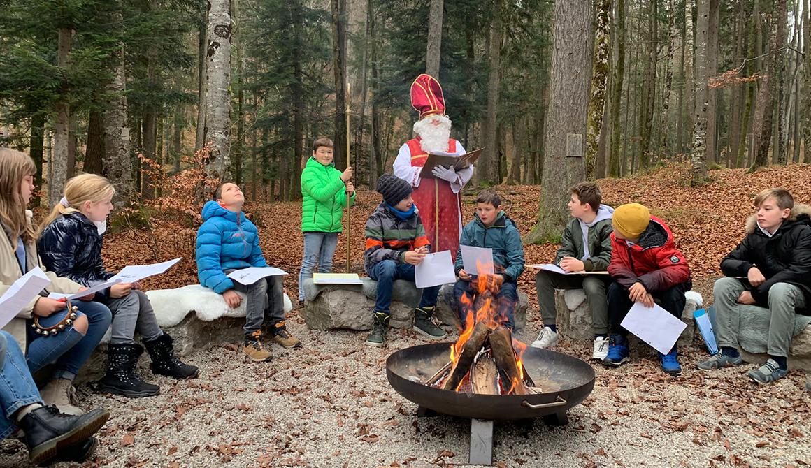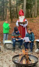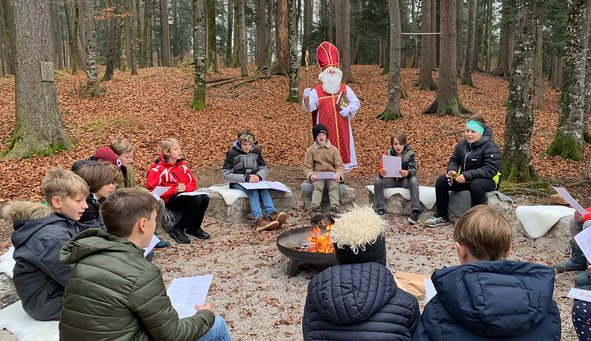 Am Montag den 5. Dezember kam der Hl. Nikolaus auf Besuch zu den Schülerinnen und Schülern der ersten Klassen. Wir wärmten uns gerade am Lagerfeuer am Steinkreis, als er aus dem Wald erschien. Empfangen wurde er mit Gesang und großen Augen. Für jedes Kind hatte der Nikolaus auch ein kleines Geschenk in seinem Sack und bedachte jeden mit ein paar Gedanken zu individuellen Stärken und Schwächen. Anschließend zog er wieder von dannen.