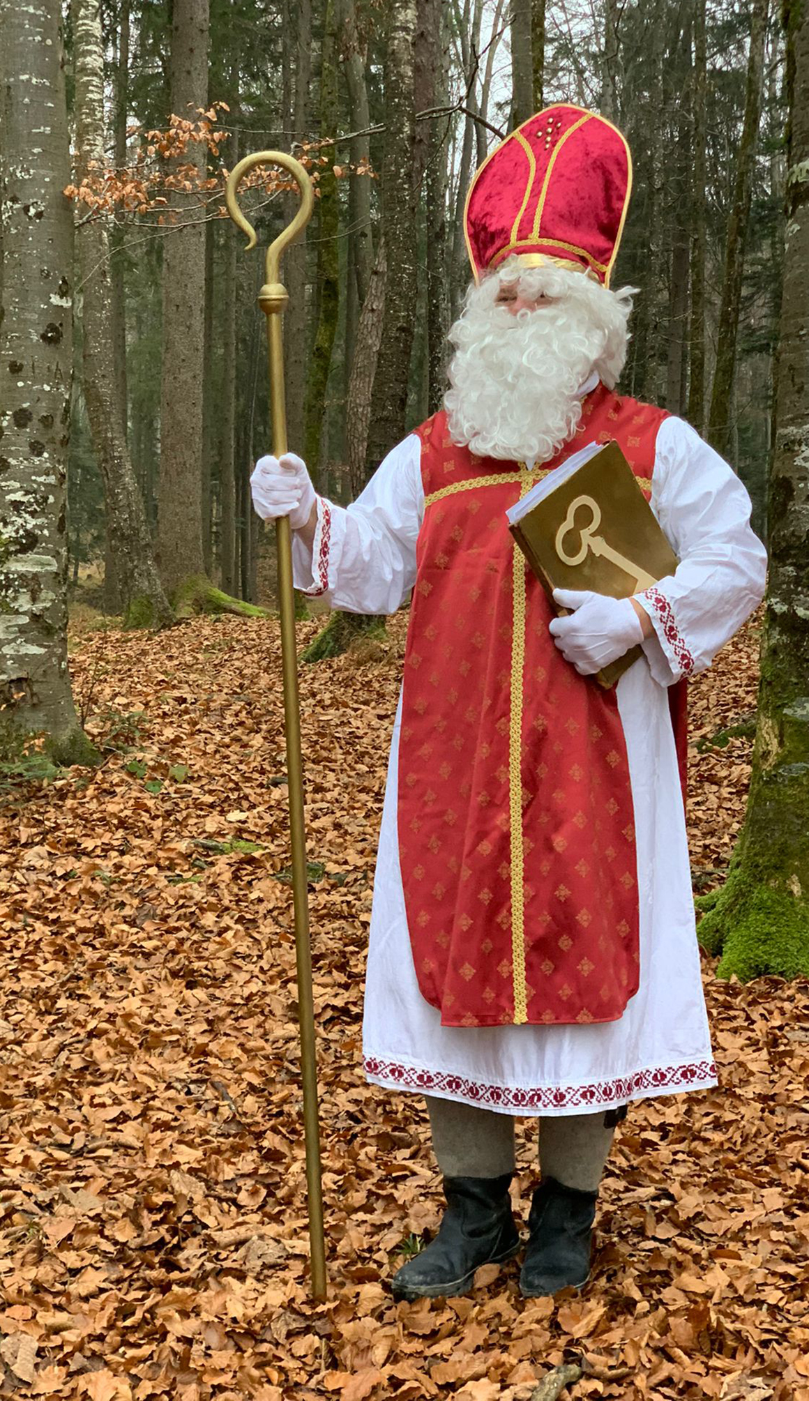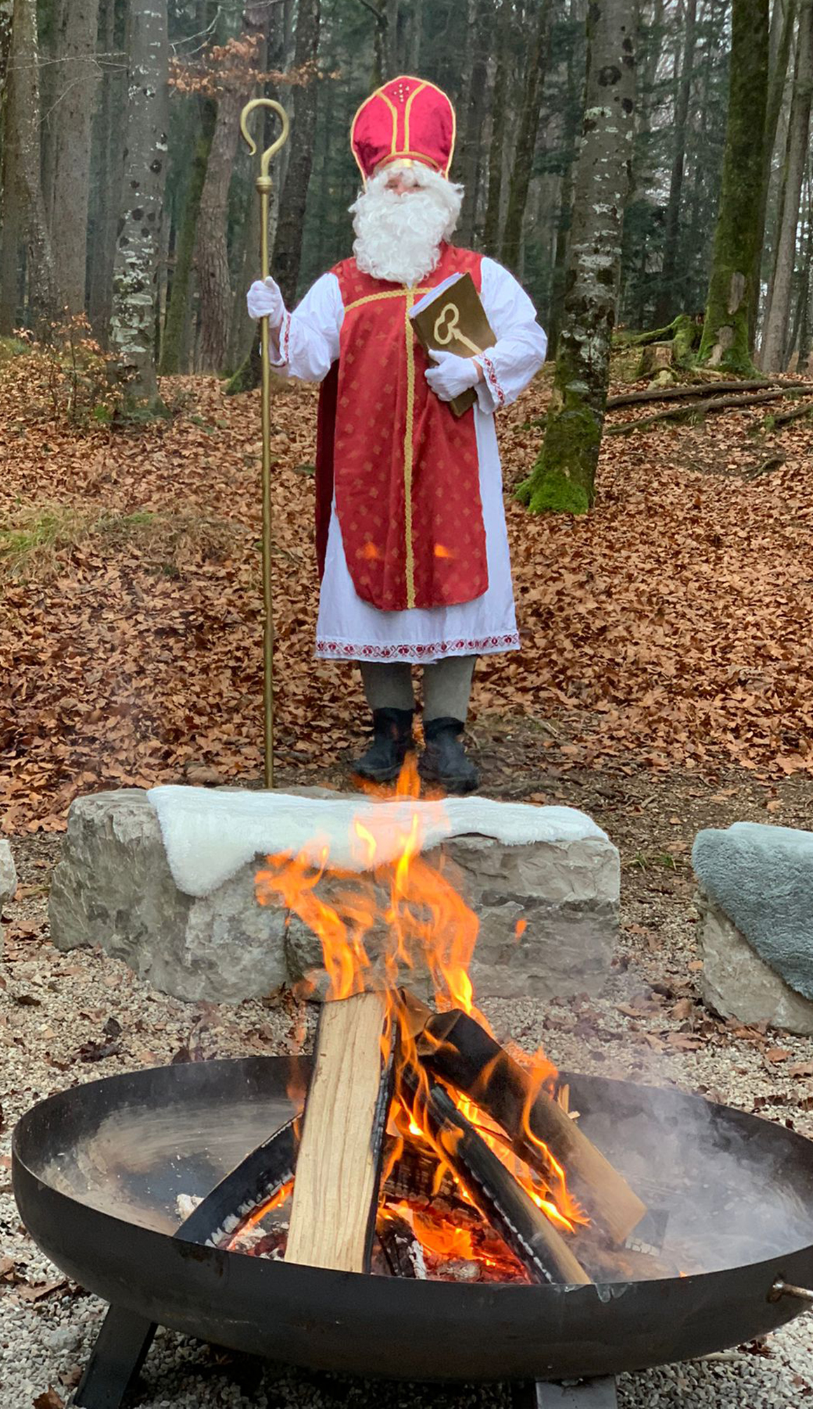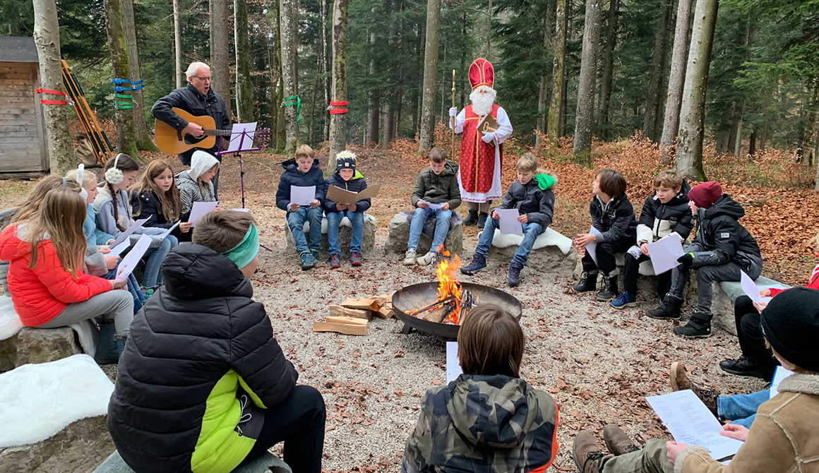 Am Montag den 5. Dezember kam der Hl. Nikolaus auf Besuch zu den Schülerinnen und Schülern der ersten Klassen. Wir wärmten uns gerade am Lagerfeuer am Steinkreis, als er aus dem Wald erschien. Empfangen wurde er mit Gesang und großen Augen. Für jedes Kind hatte der Nikolaus auch ein kleines Geschenk in seinem Sack und bedachte jeden mit ein paar Gedanken zu individuellen Stärken und Schwächen. Anschließend zog er wieder von dannen.