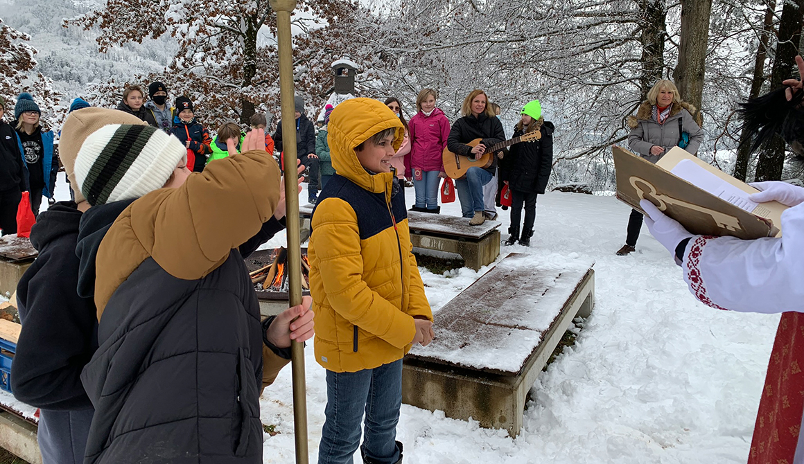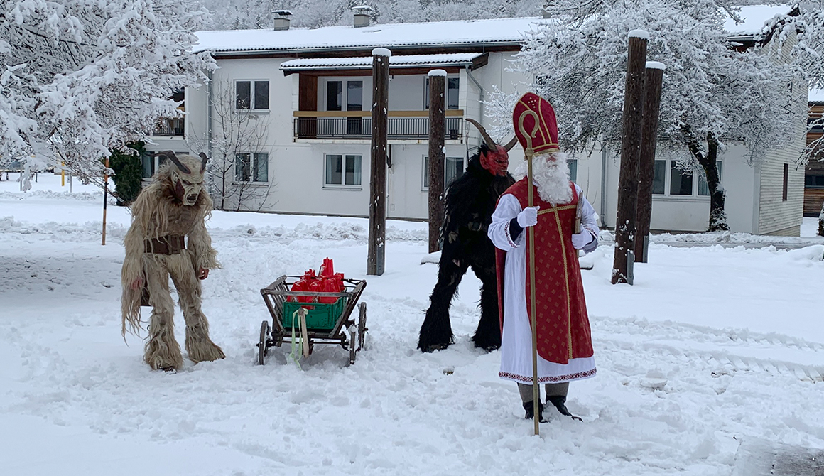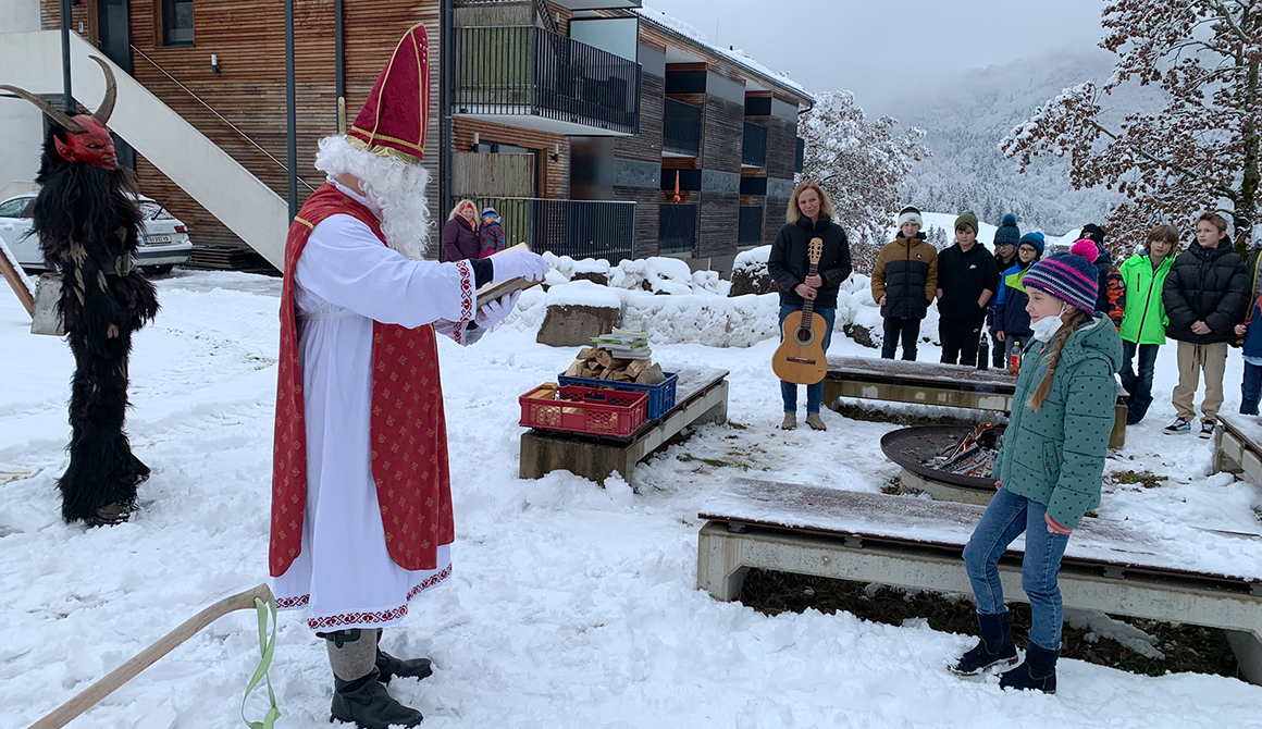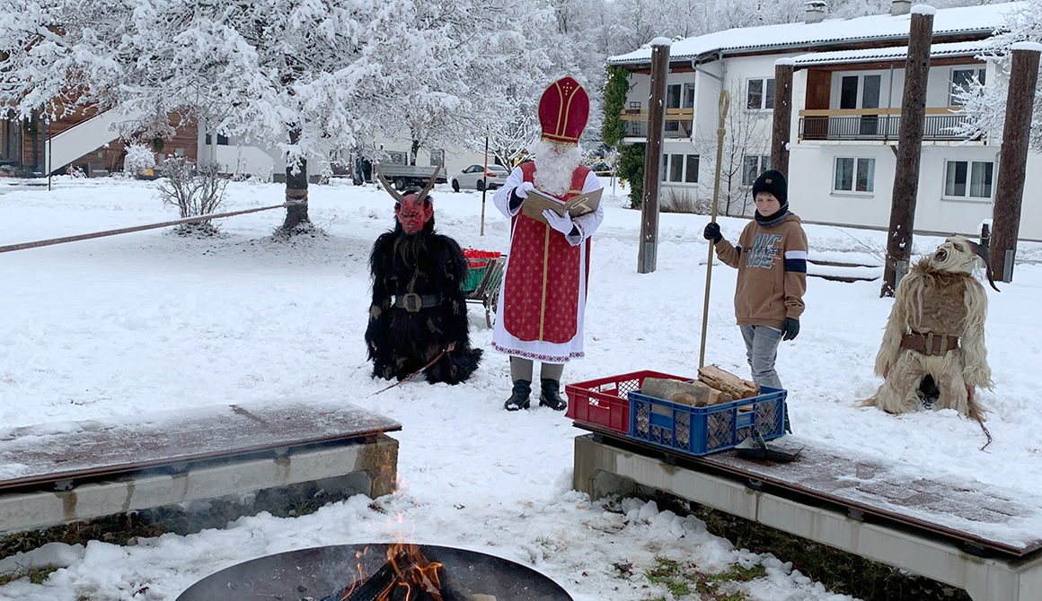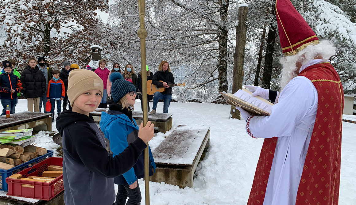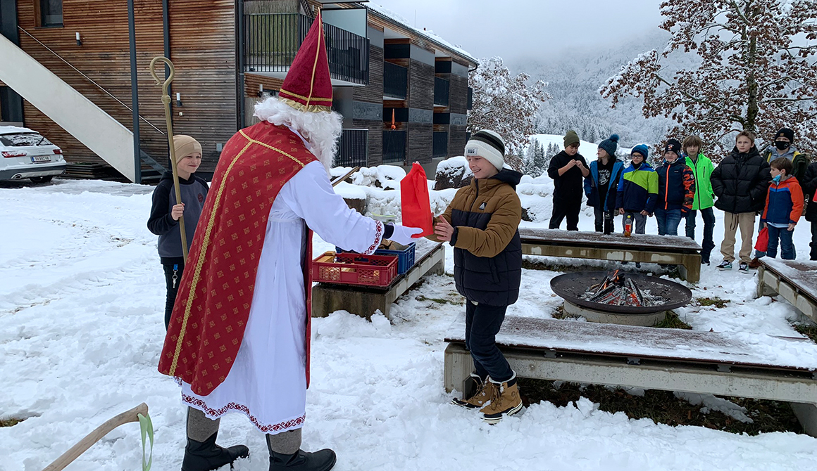 In diesem Jahr war er begleitet von zwei Perchten (Schüler des WSH), die dem Nikolaus beim Transport der kleinen Geschenke behilflich waren. Bei der Feuerstelle des Steinkreises wurde der hl. Nikolaus von den Schülerinnen und Schülern mit Gesang empfangen.