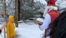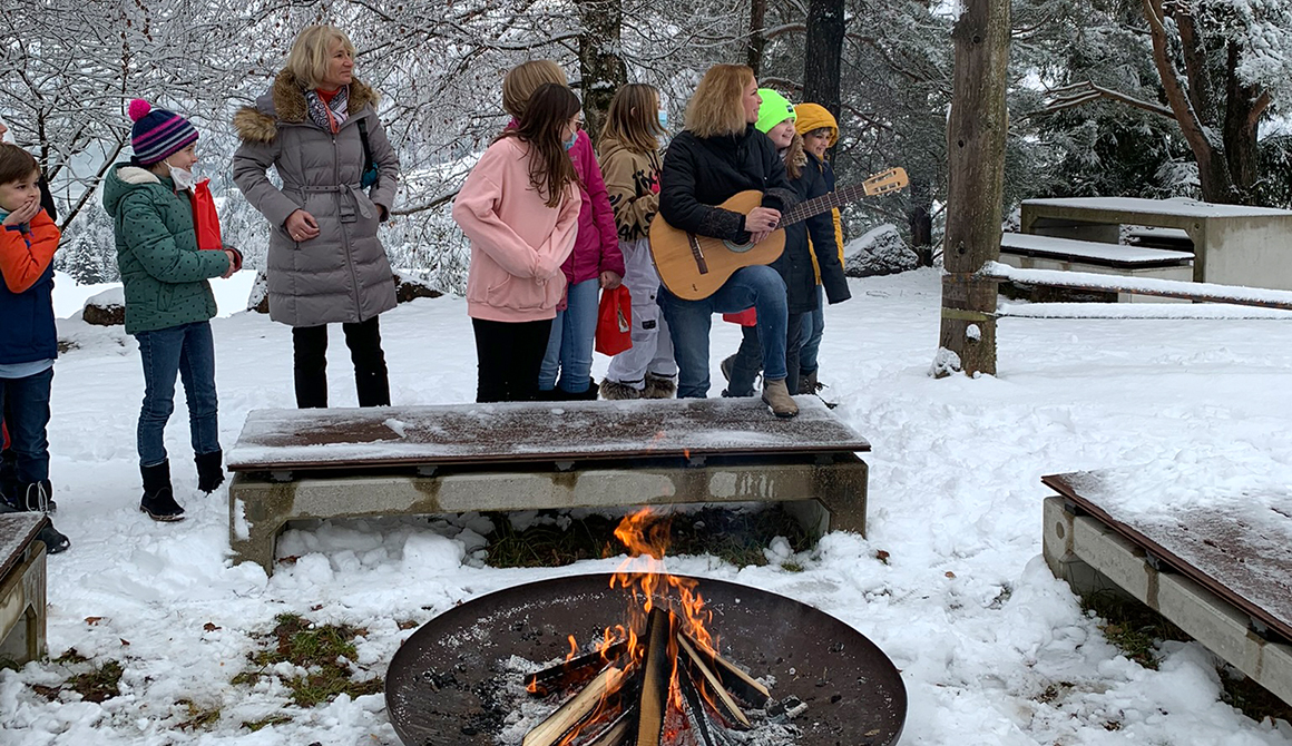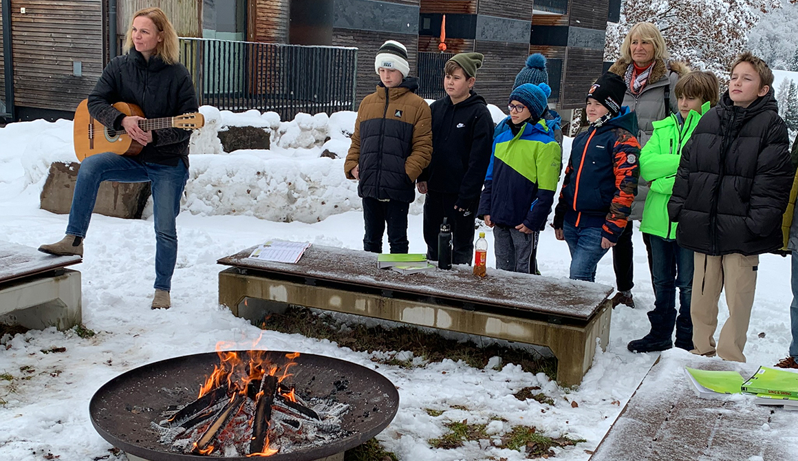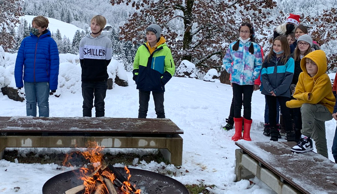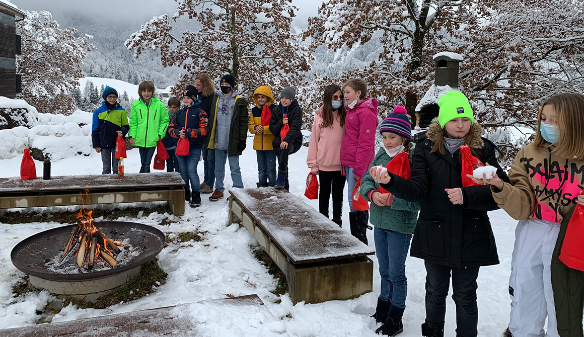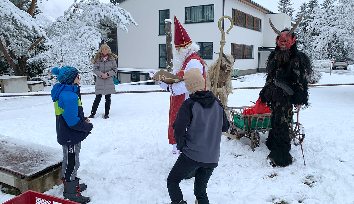 In diesem Jahr war er begleitet von zwei Perchten (Schüler des WSH), die dem Nikolaus beim Transport der kleinen Geschenke behilflich waren. Bei der Feuerstelle des Steinkreises wurde der hl. Nikolaus von den Schülerinnen und Schülern mit Gesang empfangen.