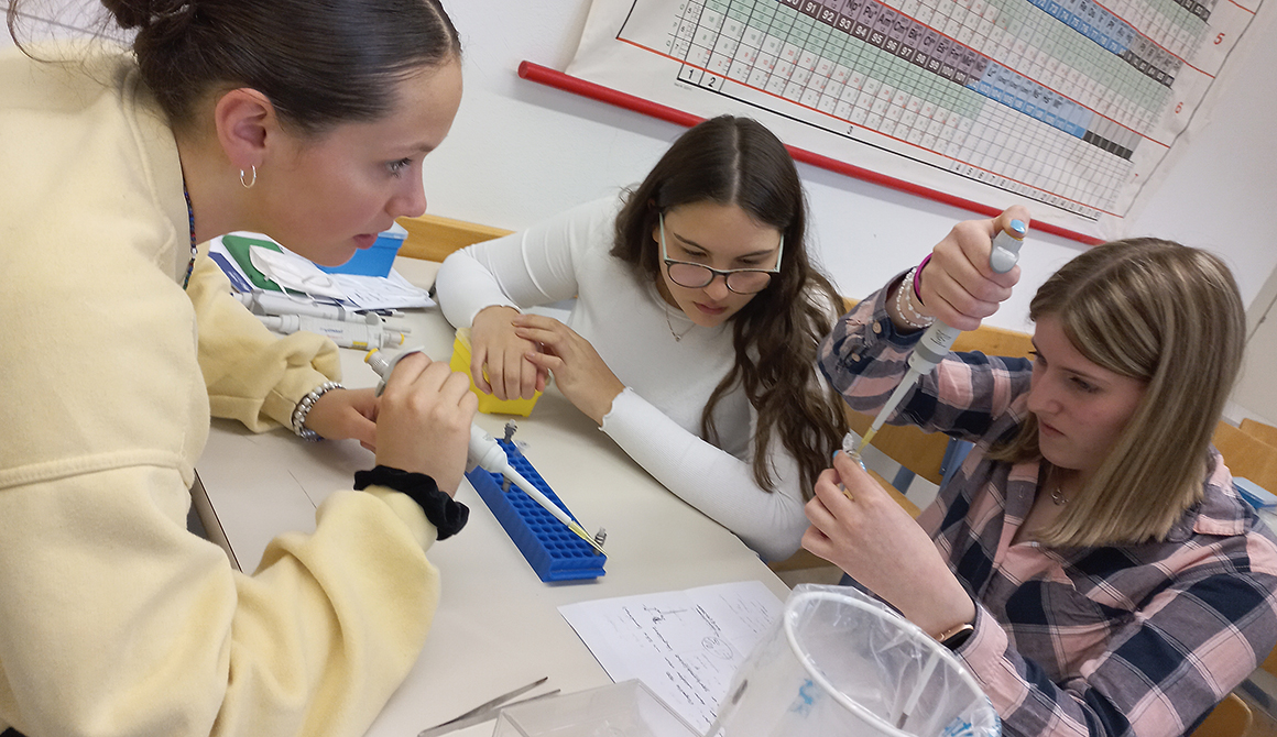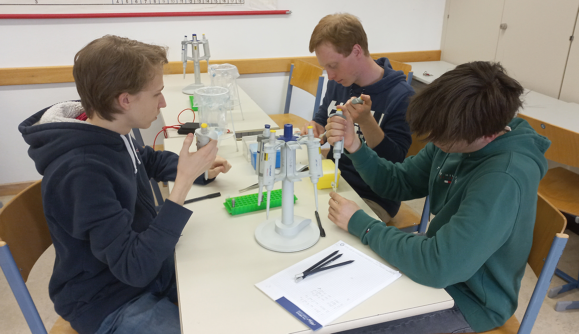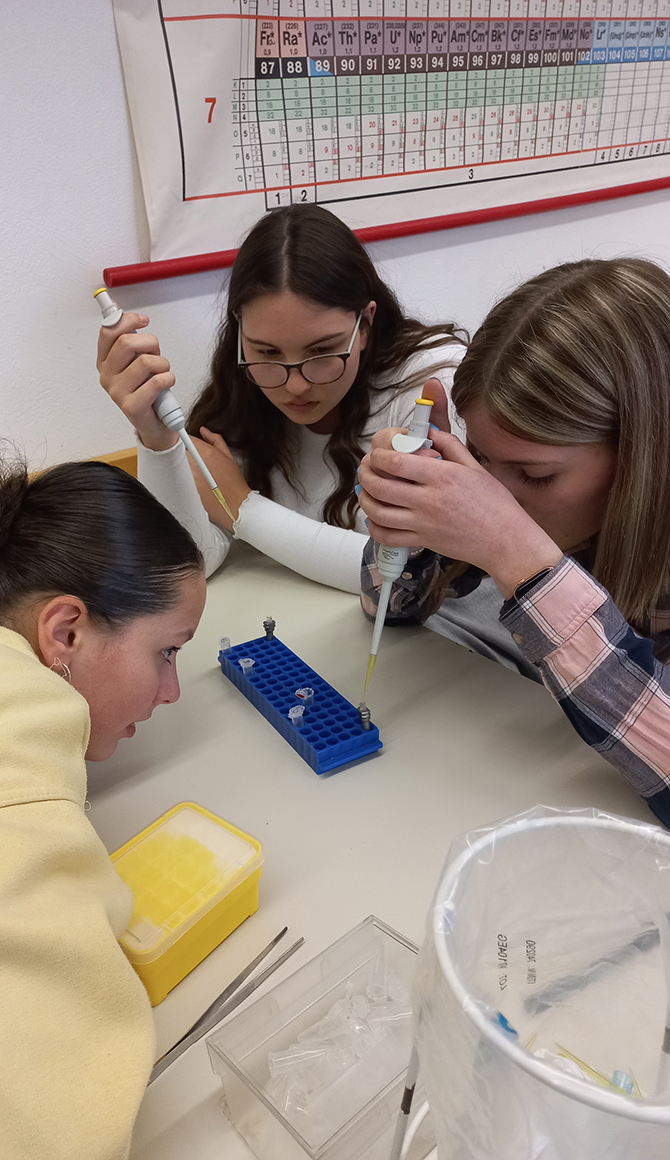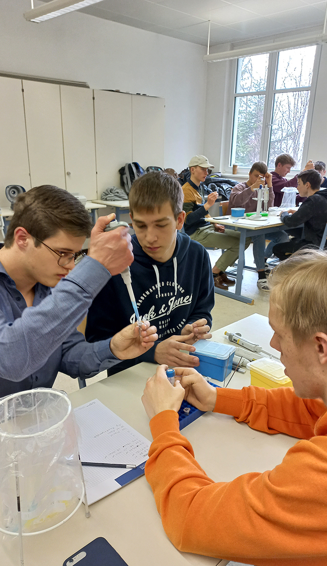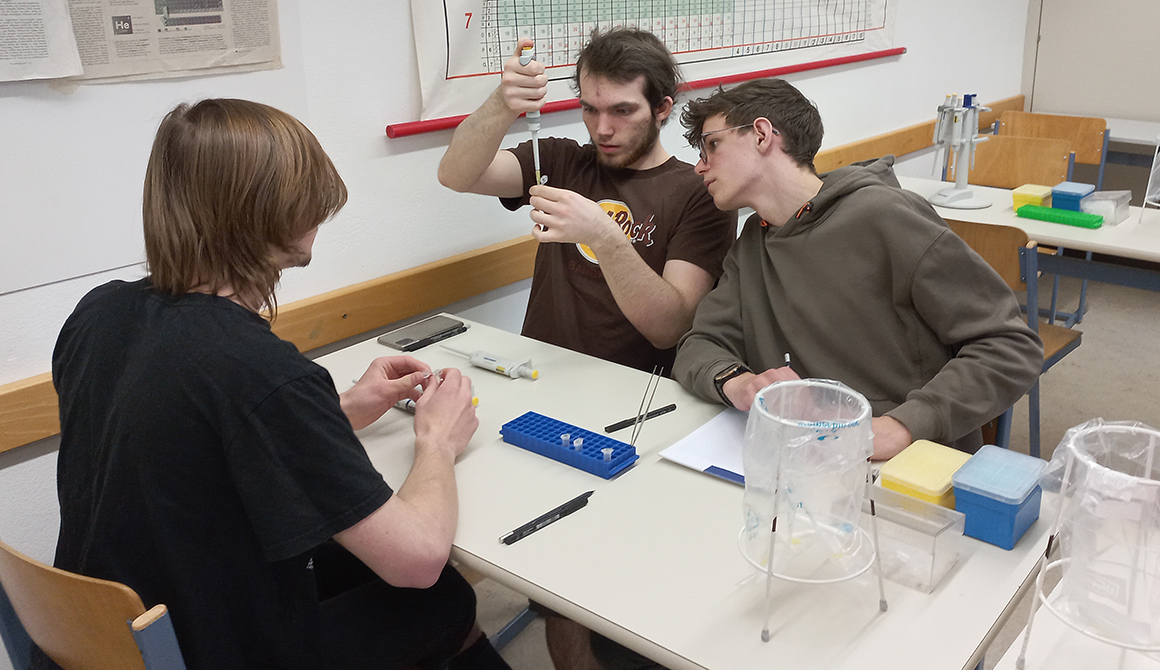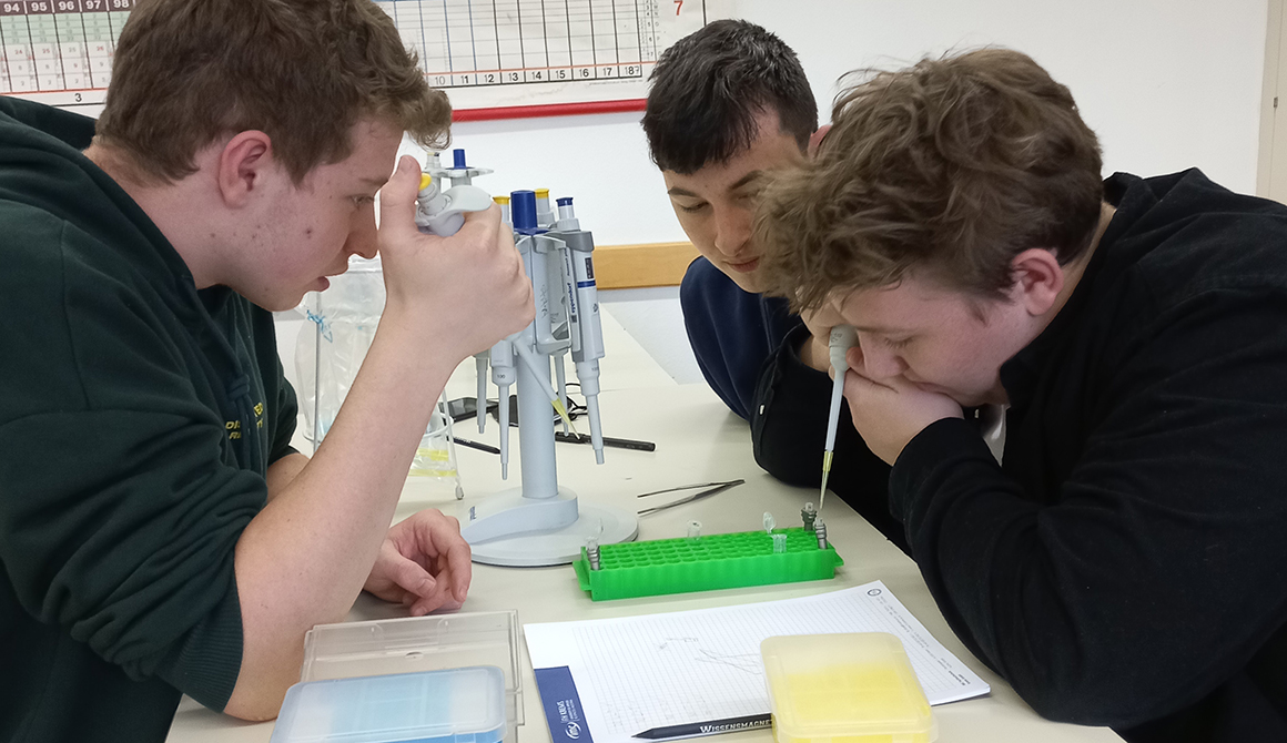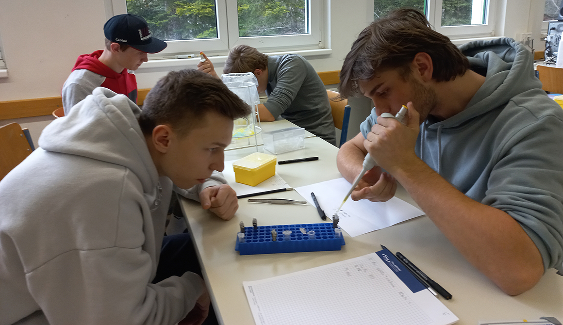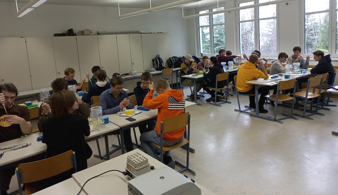 Am 31.März und 1. April konnten die Schülerinnen und Schüler der siebten Klassen einen sehr genauen Blick auf ihre Gene werfen. Im Workshop extrahierten sie die DNA aus ihren eigenen Epithelzellen, reinigten sie und machten sie für weitere Arbeiten verfügbar. Anhand der Punktmutationen (SNP-Analyse) erkannten die Schülerinnen und Schüler letztlich Variationen in ihrem Erbgut. Manche wussten danach, ob sie genetisch prosoziale Menschen sind, Vorfahren aus Zentralasien haben oder ihre Muskulatur besser im Bereich Ausdauer- oder Kraftsport trainieren können.
