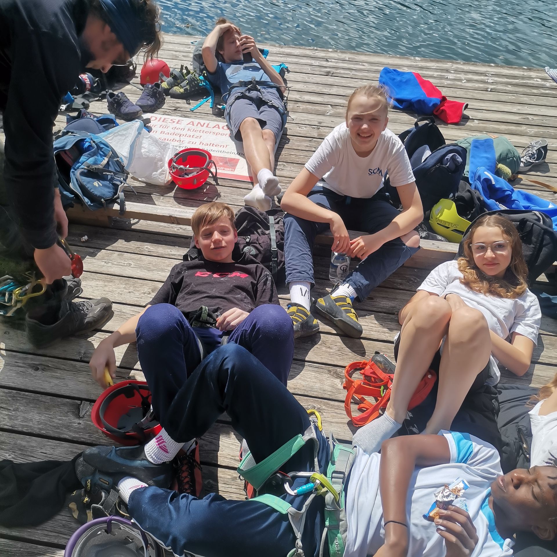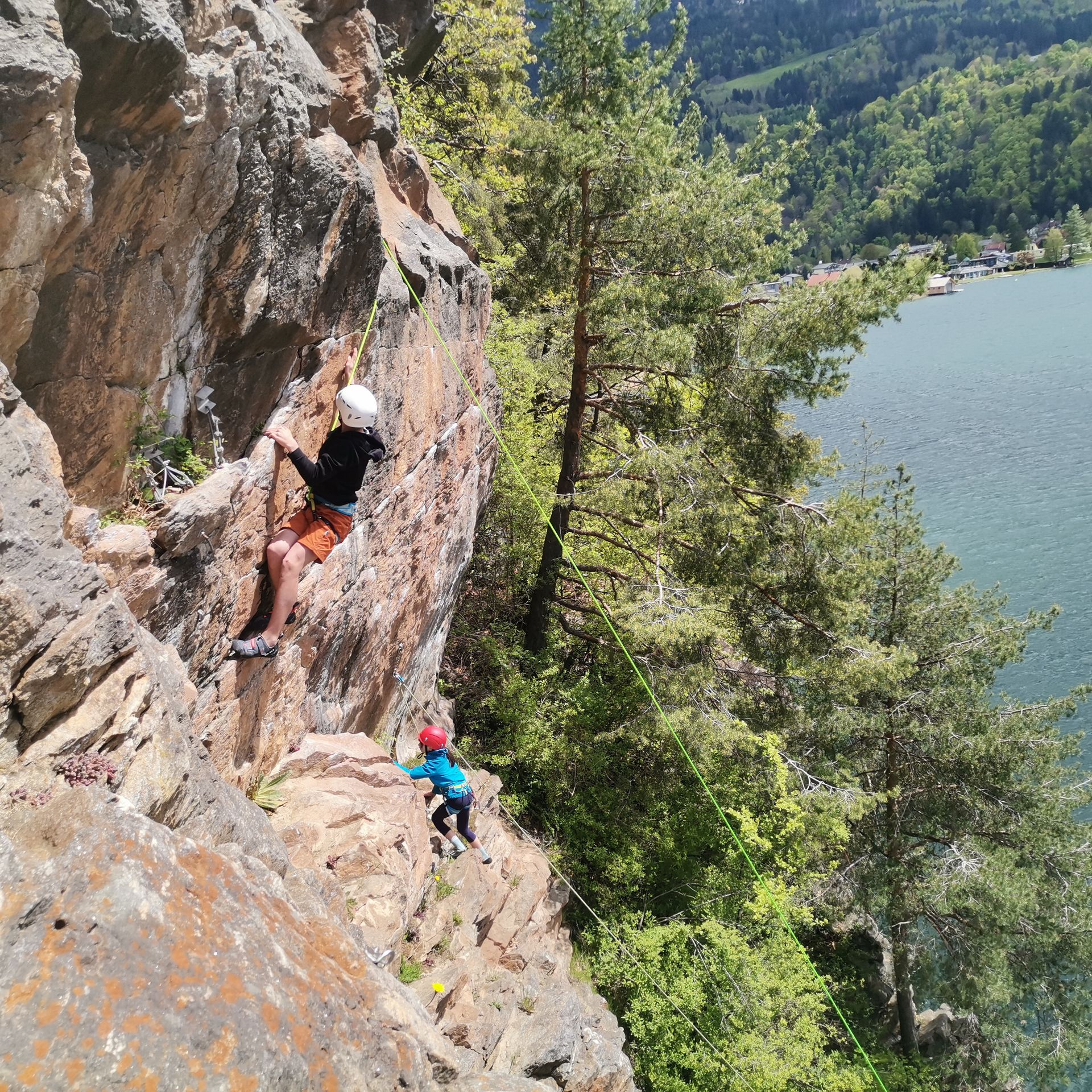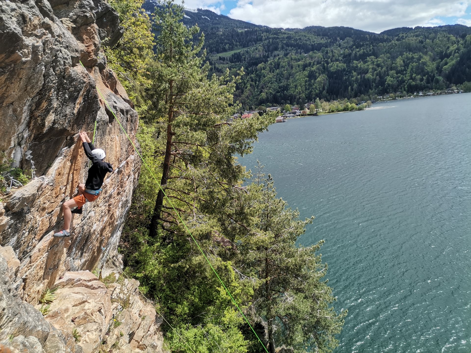 Ende April ging es mit unseren klettermotivierten UnterstufenschülerInnen nach Kärnten zum Sportklettern. Wir genossen drei Sonnentage beim Klettern am Millstättersee, bei der Skisprungschanze in Villach und im Maltatal. Besonders zu erwähnen sind unsere drei Zweitklasserinnen, die sich nicht nur geschickt beim Klettern anstellten, sondern auch sehr schnell das 1*1 des Kletterns erlernten - z.b. das direkte Einbinden mit gestecktem Achter, den Partnercheck oder das Sichern im Toprope samt Ablassen. Alles in allem drei gelungene Tage mit einer feinen Gruppe, an denen neben dem Spass auch die Lerninhalte nicht zu kurz kamen.