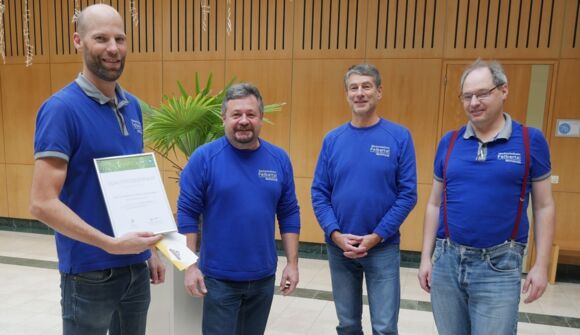 Im Bild Gesamtwerkstättenleiter Lukas Födinger bei der Überreichung des Zertifikats und der Preise an die Mechatronik-Lehrer (v.l.n.r.) Geri Inzinger, Kurt Ullmann und Martin Scharfetter.