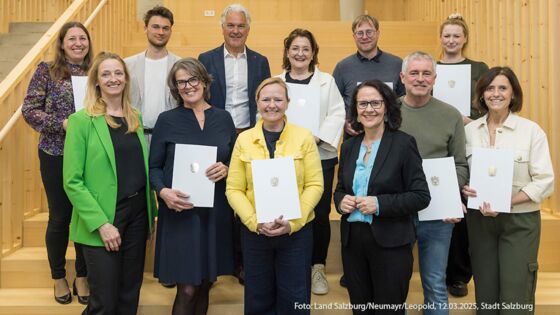 In der Tourismusschule Kleßheim ging am 12. März 2025 ein Medaillenregen auf Salzburgs Schulen nieder. 52 Schulsportgütesiegel wurden von Landesrätin Daniela Gutschi verliehen. 26 Bildungseinrichtungen erhielten Gold, 14 Schulen Silber und zwölf Bronze. 53 Prozent aller Schulen im Bundesland tragen mittlerweile die beliebte Auszeichnung. Im österreichweiten Vergleich liegt Salzburg damit mit großem Abstand auf Platz eins. Im Bild: Landesrätin Daniela Gutschi mit Robert Tschaut (Fachinspektor für Bewegungserziehung und Sport der Bildungsdirektion Salzburg) mit Vertreterinnen und Vertretern von Schulen aus dem Flachgau.
